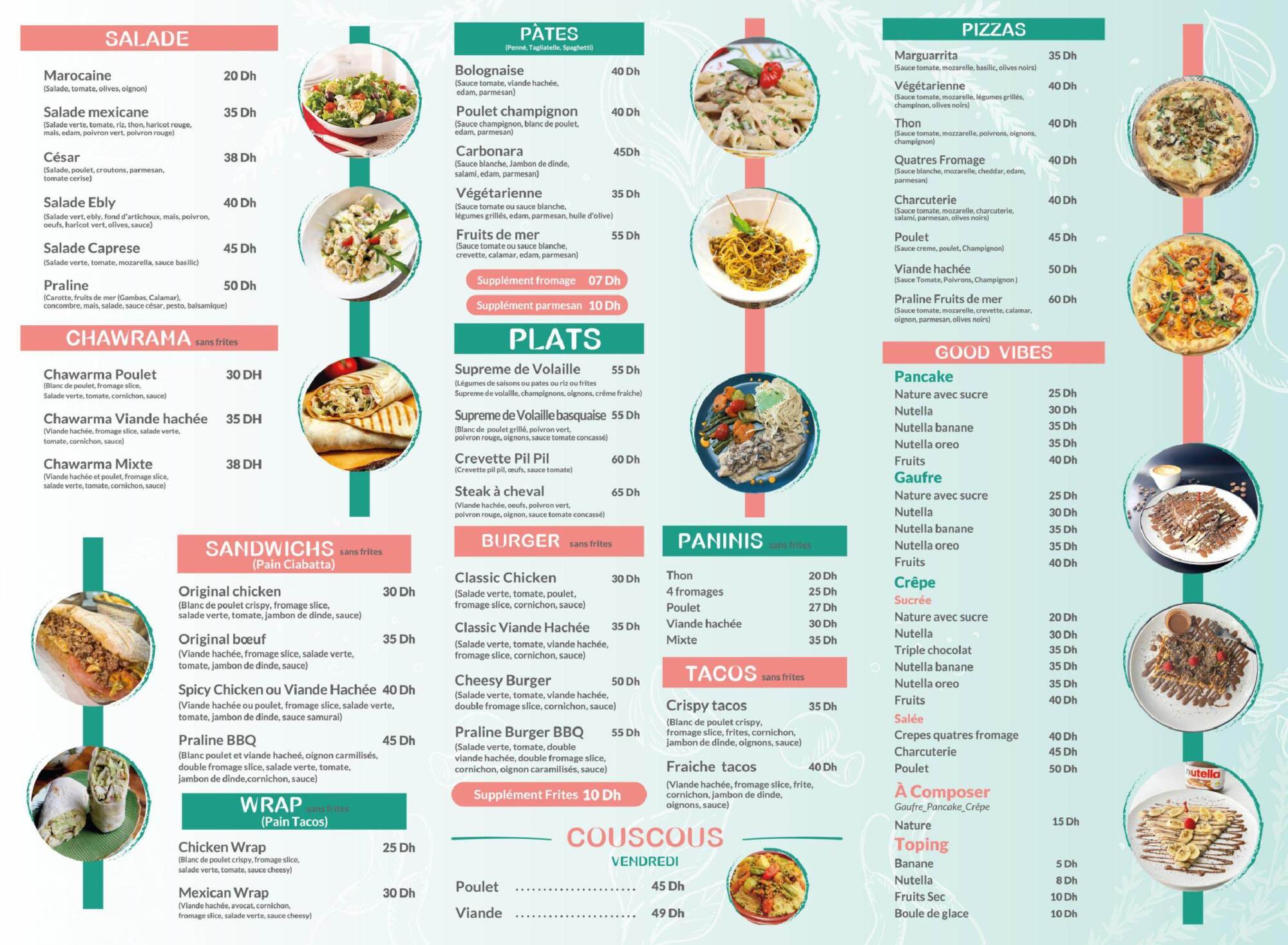 Cuisine variée, Pizza, Sandwichs, Tacos