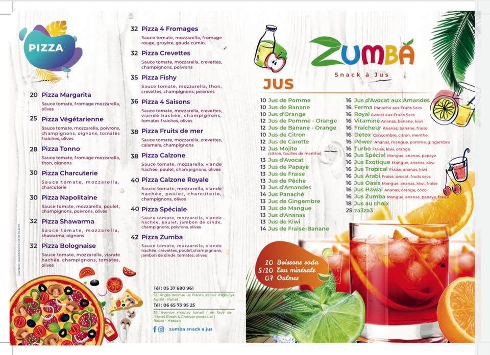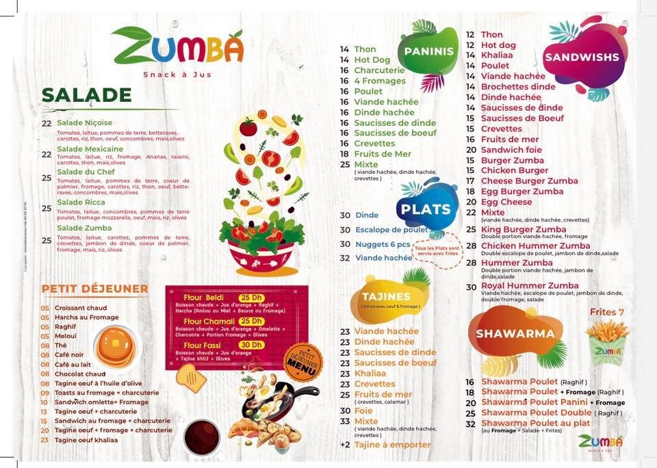 Jus de fruits, Pizza, Salades, Sandwichs, Tagine